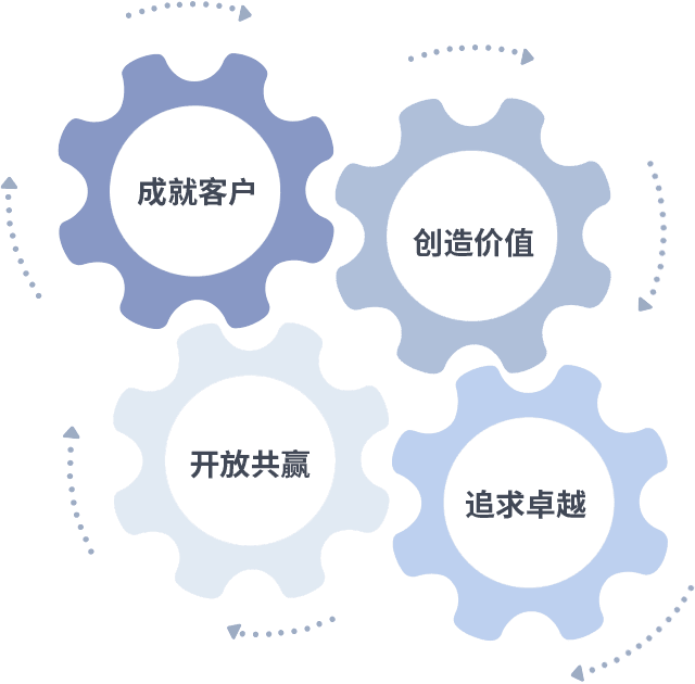 成就客户是一切决策的出发点,,,,创造价值是衡量所有工作的标准,,,,追求卓越是我们做事做人的态度,,,开放共赢是我们的格局也是最终的结果。。。。价值观的齿轮环环相扣,,推动着组织里的每个人不断向前。。。